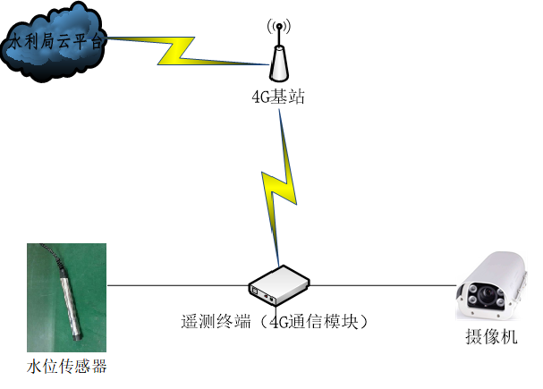 整體系統包括采集層、網絡層、數據層、運用層。數據直傳環保局平臺,因此在實際設計中我們只需要考慮采集層和網絡層即可。采集層主要監測閘門下泄流量以及視頻拍照2部分組成。網絡層主要以3G/4G 公用網絡信道通訊,系統供電依據現場實際情況可選廠用電供電和太陽能供電2種模式
